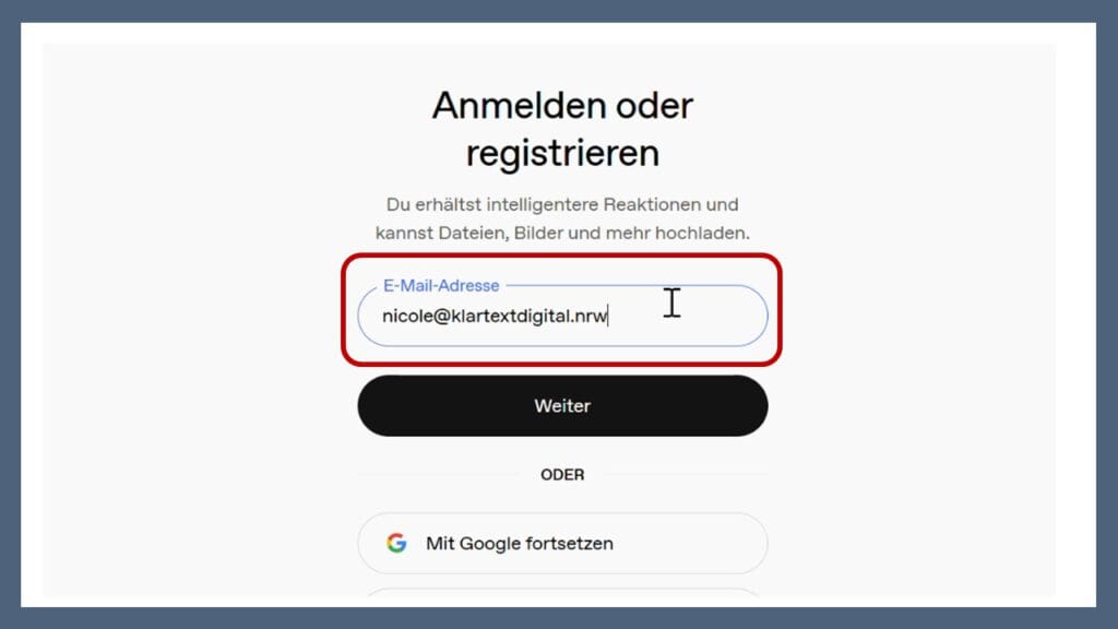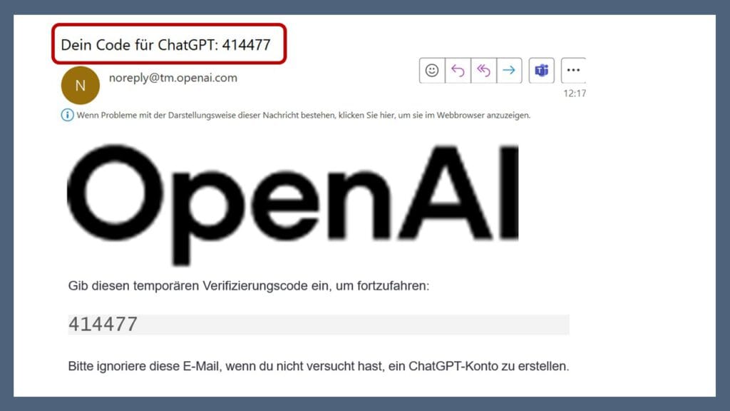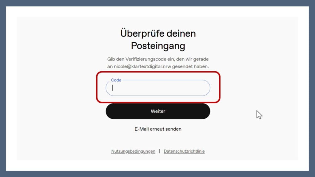 Sie werden gebeten einen Code einzugeben: Rufen Sie die E-Mailadresse ab, die Sie im vorherigen Schritt angegeben haben und schauen Sie nach, ob Sie eine E-Mail mit dem Betreff: „Dein Code für ChatGPT“ erhalten haben. Kopieren, notieren oder merken Sie sich den Code.
