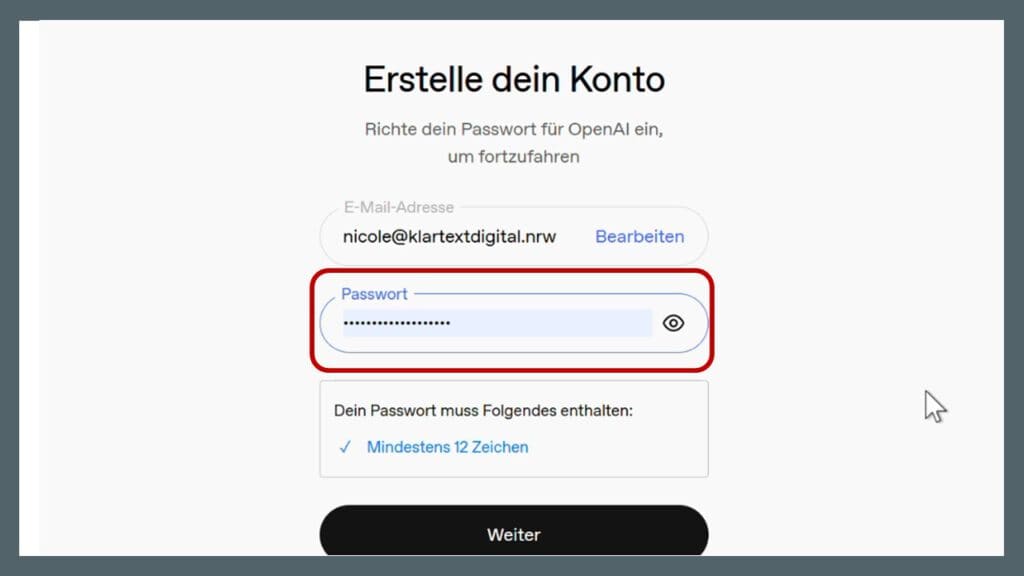 Legen Sie ein Passwort fest. Das Passwort muss mindestens 12 Zeichen lang sein.