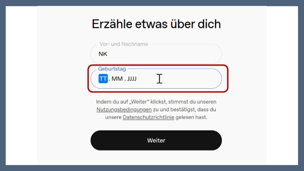 WICHTIG: Es wird nicht überprüft, ob diese stimmen. Aber es wird überprüft, ob Sie laut eingegebenen Datum alt genug sind, um ChatGPT nutzen zu dürfen.