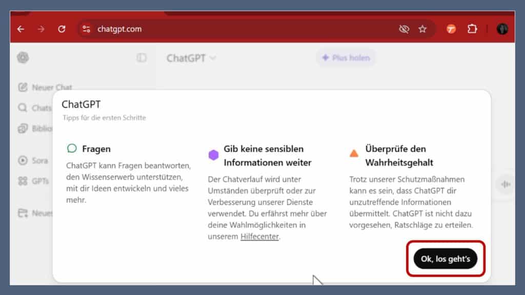 ChatGPT begrüßt Sie möglichweise mit einigen Meldungen, z.B.